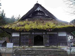 | 屋根の茅葺が苔むした風情のある寺院建築のある景観。 |