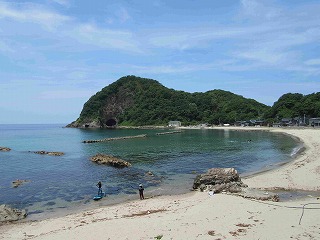 | 切浜は県道11号香美久美浜線の道路沿いにある砂浜で、きれいな水の海水浴場です。海水浴場の端には洞門もあり、砂浜、洞門、集落風景が一体になった景観が楽しめます。 |