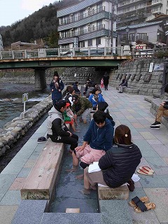 | 春来川沿いに設けられた湯村温泉の足湯を中心とした湯村温泉特有のウォーターフロントの景観 |