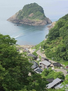 | 新温泉町 三尾トンネル海側の道路から見る三尾大島と小三尾集落 |