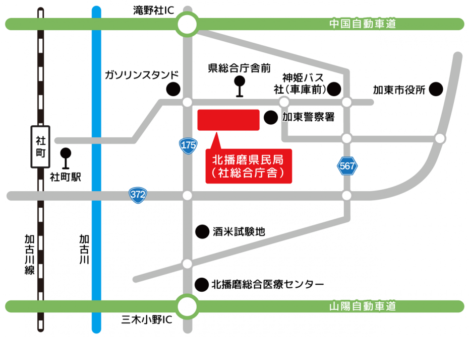 ※ 社総合庁舎長寿命化改修工事に伴い、加東土木事務所を除く事務所は、令和8年夏~秋頃から旧加東市立社小学校(〒673-1431 加東市社1550番地)に仮移転する予定です。詳細はこちらをご覧ください。