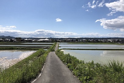 孫を保育園へ送る道、田植が終わり水が張られた田んぼは生き生きと輝きを放っています。その田んぼを突っ切るようにまっすぐに伸びた農道が夏へと続く道に見えました。おいしいお米を育む風景に感動しました。