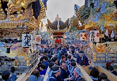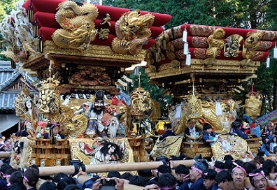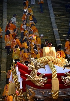 東西の神輿、14台の豪華な屋台が街中巡行と勇壮な宮入りを行い、古式ゆかしい鶏合せ神事、龍王の舞が奉納されます。