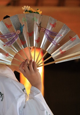 節句まつりの中で、華やかな伝統を守る浦安の舞を奉納する巫女。