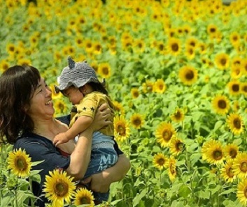 沢山のひまわりが咲く畑で、母子が楽しそうに遊んでいました。気軽に被写体になってくれました。