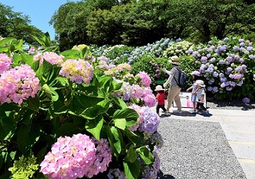 西林寺都麻乃郷あじさい園で、いろんなあじさいの花が咲く道をお母さんと子供たちが写真を撮りながら楽しんでいるところを撮りました。