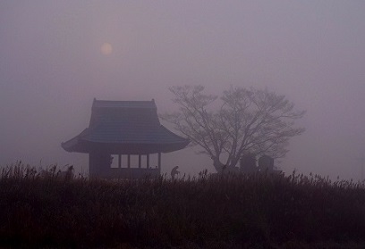 極寒の朝、黒田庄町岡にある菩提寺が濃霧に包まれる中、朝陽は御参りの姿をそっと見守っていました。