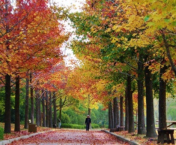 紅葉したプラタナスの下を散歩する人を入れて撮影させていただきました。朝霧の残る公園で一際目立つ赤、黄、緑の葉のコントラストに引きつけられました。このように美しい散歩道はいつまでも残したいです。