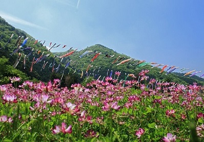 レンゲ畑に鯉のぼりが掲げられ、訪れる人々の心を魅了します。