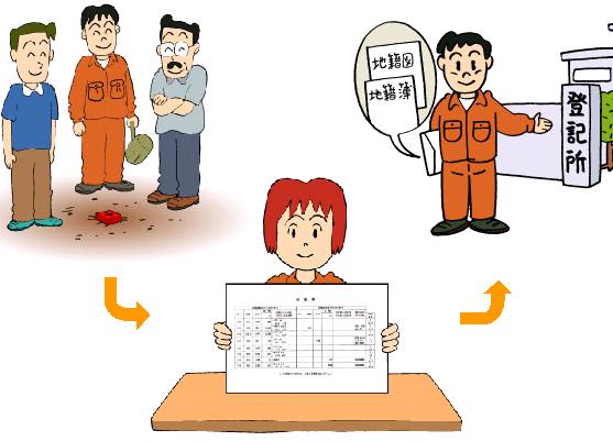 調査の成果は登記所に送られ、これをもとに登記簿が書き換えられます。また、境界がわからなくなった時も、もとどおりに復元できる地図が登記所に備え付けられます。