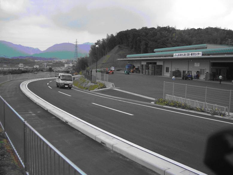 農道の開通(南あわじ市:後ろの建物は農産物集出荷施設)