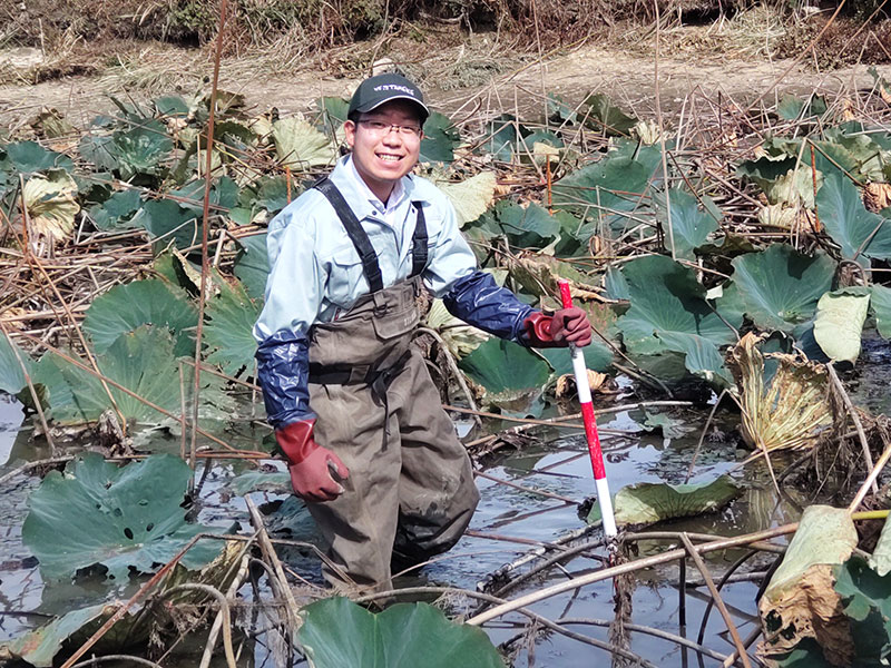大学生活とは一変し、社会人としての生活リズムにも慣れてきたところですが、それは職場の温かいサポートがあったからだと思います。配属当日、不安そうな私の顔を見て笑顔で接してくれた先輩職員のおかげで、すぐに職場に溶け込むことができました。新しい仲間として丁寧に迎えてくれることに感動し、新人の受け入れ体制が充実していると実感しています。現在は、東播磨地域のため池改修工事を担当しており、工事資料の作成や関係者との協議など、任せられることも増えてきました。自分の考えを主張して仕事を進めることができ、周囲の方々からその主張を尊重して頂きサポートしてもらえるので、自己の成長を感じながら楽しく仕事ができています。