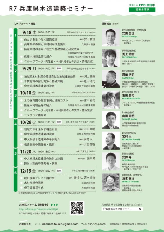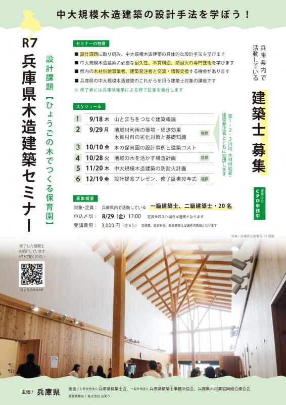 「兵庫県木造建築セミナー」を開催いたしますので、建築物の木造化及び兵庫県産木材利用に意欲のある建築士及び木材供給者、公共・民間建築物の発注担当者の参加をお待ちしています。