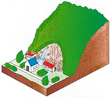 山地災害危険地区とは、山崩れ、土石流、地すべりなどによって人家や公共施設などに直接被害を与えるおそれのある渓流や自然斜面について調査を行ない、地質や地形などから一定の基準以上の危険度であると、判定した地区のことです。