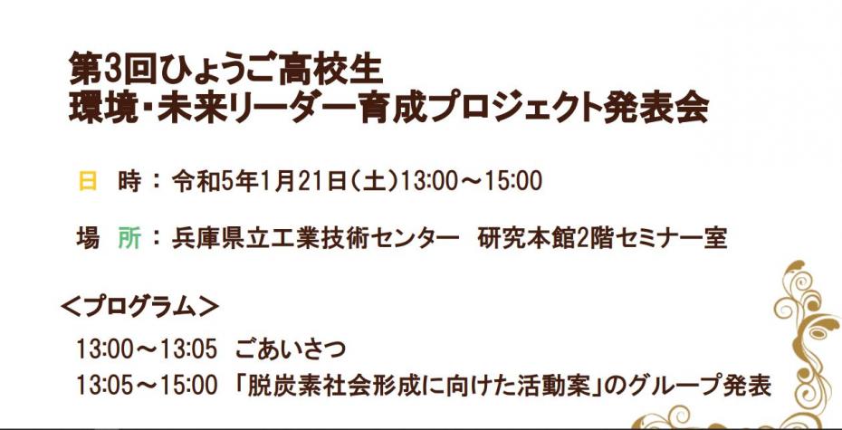 「ひょうご高校生環境・未来リーダー育成プロジェクト」では、令和4年10月から令和5年1月までの計5回(6日間)にわたり、専門家や企業家、行政職員を講師に迎え、県下全域から集まった高校生29名が、脱炭素社会の実現に向けた様々な取組について多角的に学び、その解決策として自分たちに何ができるのかを考えてきました。