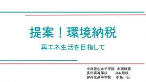 国民全員が再生可能エネルギーを使って生活する社会を作っていくには、費用の負担が最も大きな足かせになっていると考え、その資金を作り出す方法「環境納税」を提案。県内で環境の取組を進めている市に納税し、返礼品として再生可能エネルギーに関連するものを納税者に渡す。納税は再エネを普及されるものに使われる。