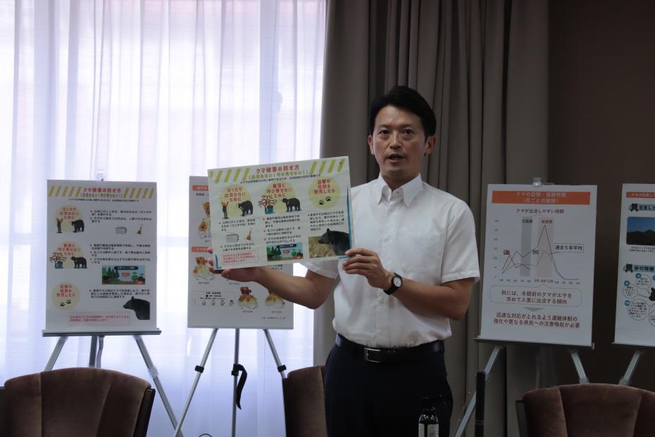 会議では、森林動物研究センターからツキノワグマの出没情報等が報告され、短期的及び中長期的な被害防止対策の実施に関することの確認、知事からクマによる被害発生を防止するための注意喚起を行いました。