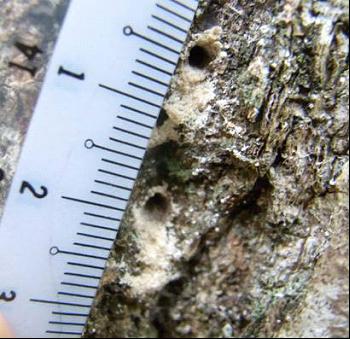 ウ樹幹の大径部(高さ2~3m程度)にφ2.0mm程度の穿入痕が多数みられる。 カシナガの密度が多くなると樹幹の高い位置でも穿入する。 |
