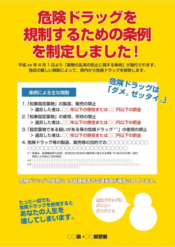 しかし今回のチラシの目的が、危険ドラッグに関係する可能性のある住民に対して、「これまでよりも取り締まる範囲が広くなったよ、やめといた方がいいよ」と訴えかけ、住民に「わ、じゃあコレ、やめておこうかな」という具体的なアクションを起こしてもらうことにあるならば、その対象(ターゲット)に伝わる言葉に置き換えなければいけません。
