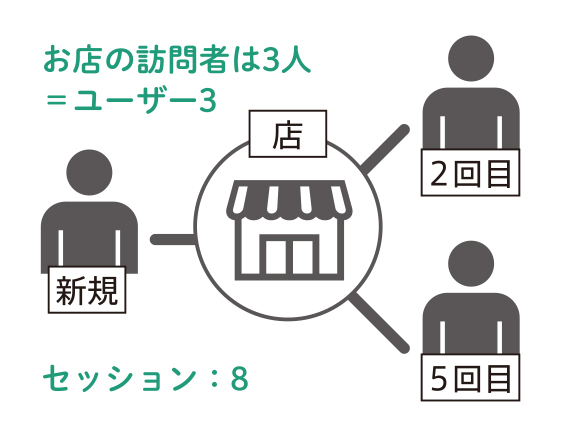 ユーザー・新規ユーザー・セッション ユーザーは訪問者の数。新規ユーザーとの割合を見れば、お店(サイト)のリピート率を把握できます。 同じ人が3回訪問すれば3カウントする、その総数をセッションと言います。 |