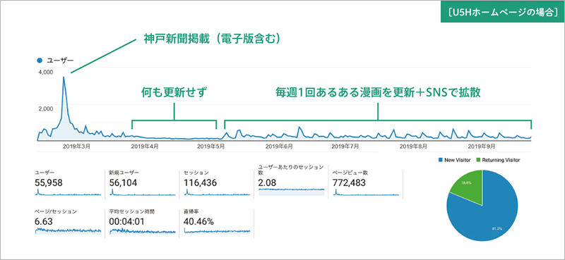 U5Hのホームページの場合、サイトの更新やSNSの投稿など何かしらの動きに呼応するようにアクセス数が変化します。新聞に掲載された場合は当然ピークが出ますし、何も更新しなければアクセス数は徐々に減少します。