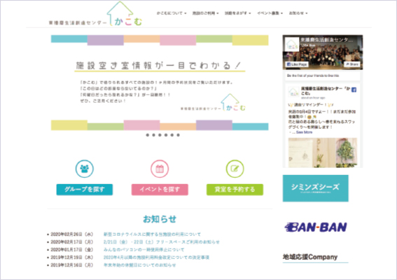「かこむ」は、コミュニティースペースのサイトとして必要な、団体登録、イベント検索・申し込み、貸室予約等のための機能が複数盛り込まれています。