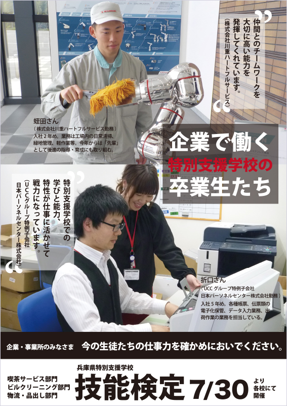 最後になりますが、これはいちばん最初に考えるべき内容かもしれません。ラックに置く場合にタイトル(キャッチコピー)は上部に配置するのはもちろん、誰が誰に手渡すかによっても構成は変わります。例えば、このチラシ。技能検定開催側が採用側の企業に手渡すことを考えたキャッチコピーになっています。