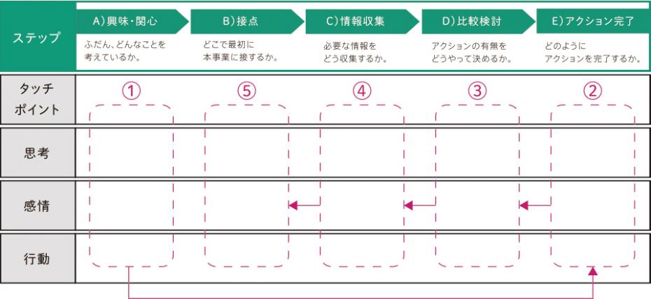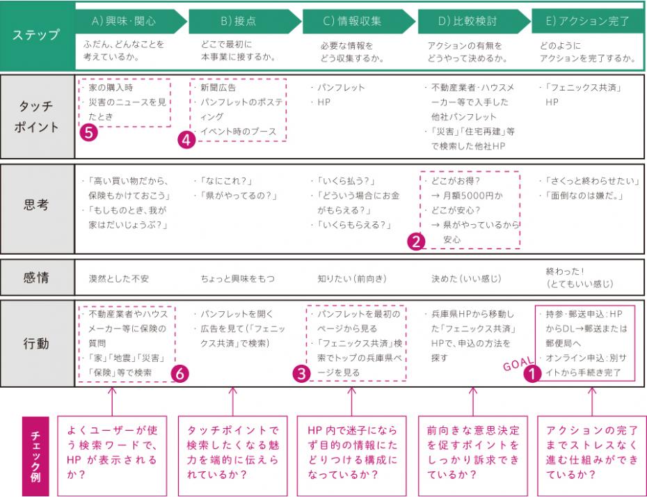 想定するユーザーの「行動」、背景にある「思考」や「感情」が、どう動くのか、時系列にまとめたもの。