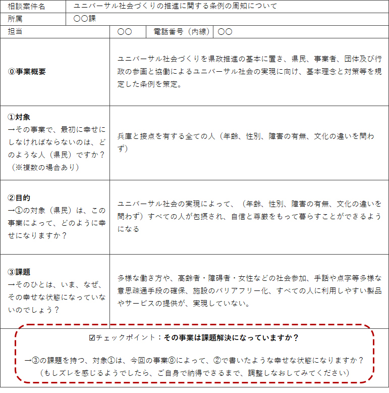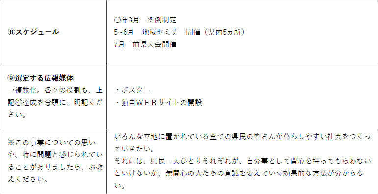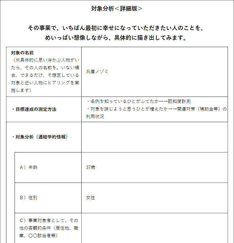 「その事業で、いちばん最初に幸せになってもらう県民」のことを、できるだけ詳しく想像するためのシート。妄想にならないように、実際に事業の対象として想定される人にヒアリングしながら作成することをおすすめします。たとえば、「若者に何が響くか」は、やっぱり若者に聞かないとわからないですよね。