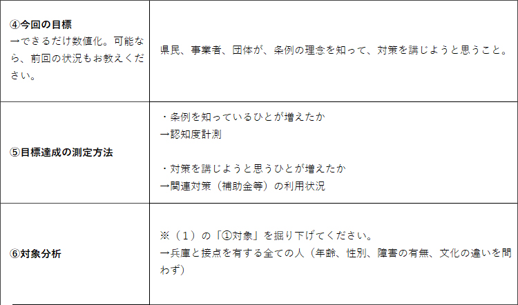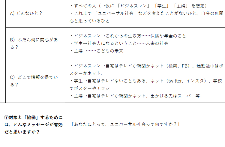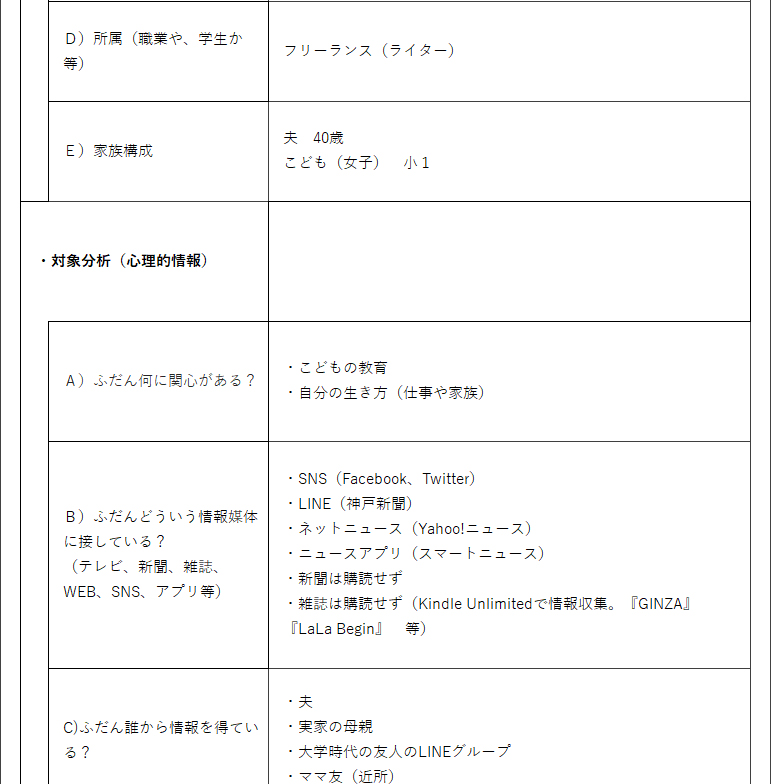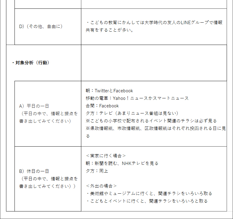実際する小学1年生の母親へのヒアリングシート。彼女に、今回の目標である「条例を知っている人」になってもらう広報として、以下のようなことが考えられます。