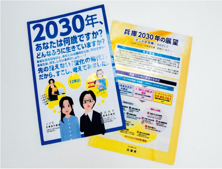 そうなんですよね。相談の場では理想的な話をするのだけど、職場に戻ると現実的な面が見えてくる。仕事量しかり。「兵庫2030年の展望」の場合は、このリーフレットとは別に、やはり審議会など関係者向けに従来の概要版も必要ということで、概要解説版と若者向けの2パターンを作ることに落ち着きました。若者向けのリーフレットには、展望について語る具体的な主体として、湯川さんとノゾミさん*のイラストを表紙から大きく登場させて。私はこのリーフレットが仕上がってすぐ異動になったのですが、ビジョン課の職員から後日談で「出前講座などで配布すると、おもしろそうに読んでくれているよ」と手応えも聞いています。(*中山さんをモデルにした架空のキャラクター)