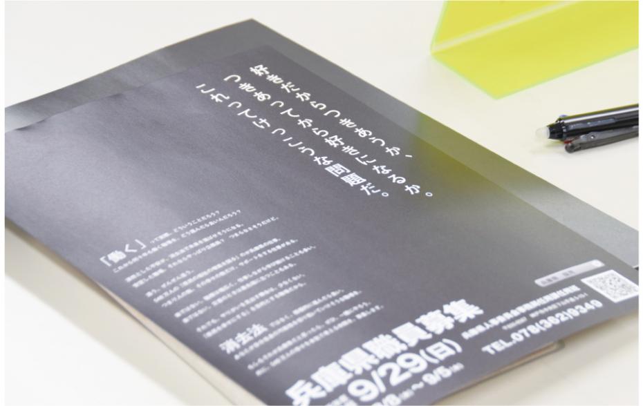 逆に……ではないんですが、僕は最初は正直「相談に行ったら、広報戦略課が素敵なもの作ってくれるんや」と勘違いしていて。というのも、2018年度の担当者が全庁広報会議で相談して作った兵庫県職員募集のポスターがすごく好評やったんです。マスコミに取り上げられたり、受験者の学生さんから「本気で受験を考えていたときに、シックな感じが響いた」「自治体然としていなくて、かっこいいと思った」という声をいただいたり。それで2019年度、職員採用動画を担当することになって、相談に向かうためにエントリーシートを書こうと開いたら「え……」って。