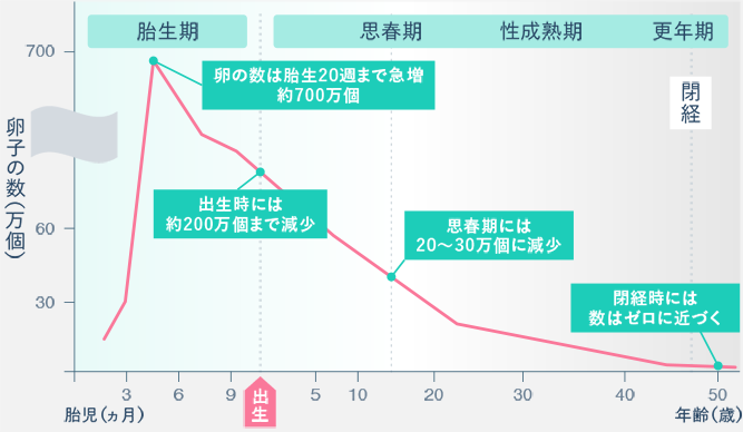 卵子は、出生後は新たに作られることがなく、質・量ともに減少し続けます。 そのため、年齢とともに、妊娠しにくくなったり妊娠の異常が起きやすくなります。