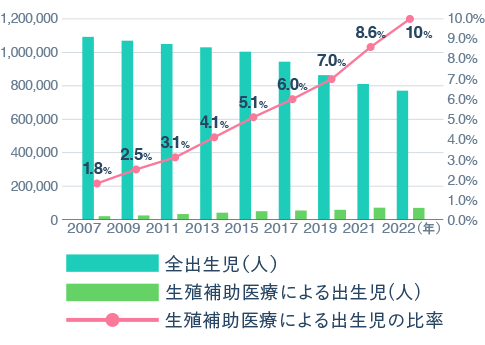 2023年には全出生児約73万人のうち約8万5千人が不妊治療によって誕生しています。これは約9人に1人の割合です。