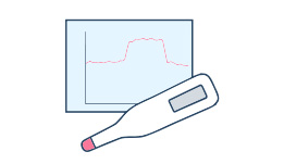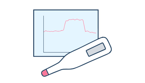 基礎体温とは、生命維持に必要な最小限のエネルギーしか使っていないときの体温のこと。起床後寝たままの状態で、舌の裏側の付け根に婦人体温計を当てて測定します。女性のからだはホルモンの影響で、周期的に基礎体温が変化します。基礎体温からは次の月経予定日や妊娠しやすい時期、さらには妊娠の可能性も予測できます。