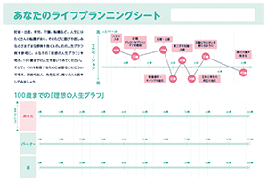 妊娠・出産、育児、介護、転職など、人生にはたくさんの転機があり、そのたびに喜びや悲しみなどさまざまな感情を抱くもの。下の人生グラフ例を参考に、あなたの「理想の人生グラフ」を考え、100歳までの人生を描いてみてください。