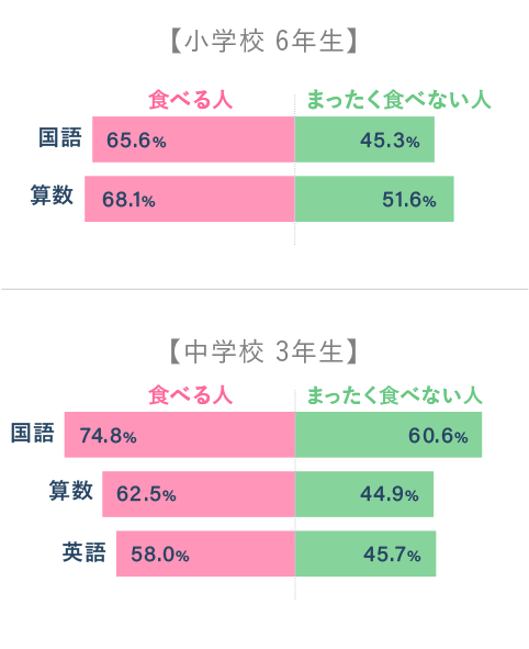 どの教科も朝食を食べている人のほうが、学力テストの結果がいいんだよ!
