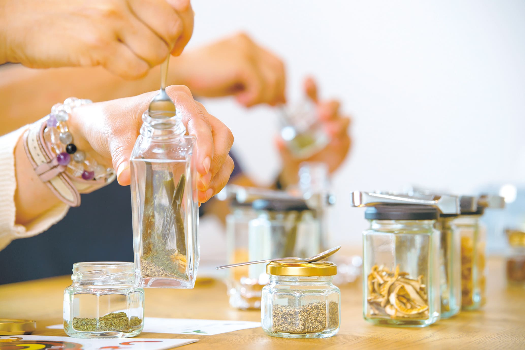 昆布やタカノツメ、煮干し、干しシイタケ、サンショウなど11種類の乾物や薬味の中から好みのものを選び、瓶の中へ。生しょうゆを加えて「Myしょうゆ」の出来上がり。 |