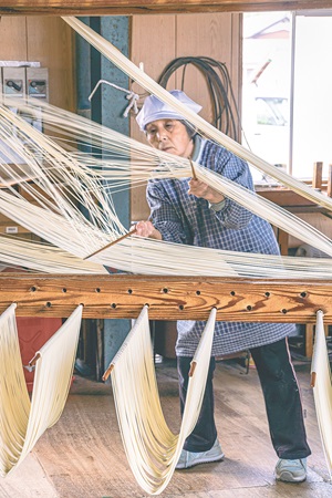 南あわじ市内11カ所の製麺所で製造される淡路島手延べそうめんは、国内流通量の1%にも満たない上に各社が独自に販売していることから、“幻のそうめん”といわれています。昔ながらの手作業で延ばす麺は細かくてこしがあり、のど越しの良さが自慢です。雨が少なく冷たい季節風が吹く気候はそうめん作りに合い、漁業者の冬場の副業として広まりました。