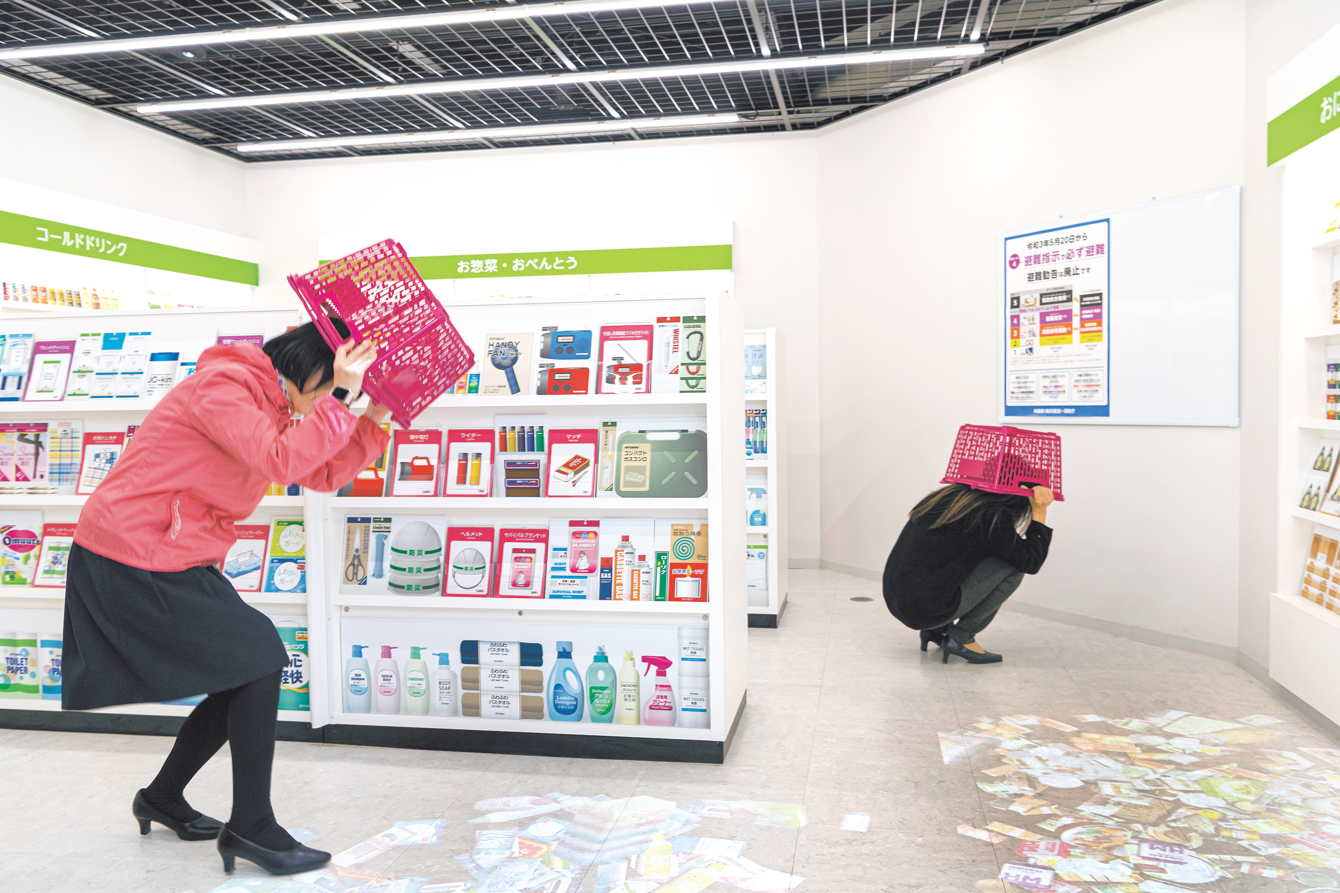 コンビニで地震が発生したらどうするか、体験しながら考えるコーナー |