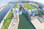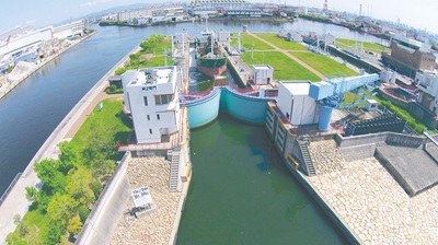 尼崎市の臨海部は公害問題に悩まされた時代もありましたが、今では多くの魚が住む豊かな海に変化を遂げています。立ち並ぶ工場への輸送路として造られた運河は現役で、原材料や製品を積んだ貨物船が行き交います。工場群を縫うように流れる運河を航行するのが「尼崎運河クルーズツアー」です。出入り口となる日本最大級の閘門「尼ロック」を通過し、門の開閉によって水位が上下するのを体感。船上では、尼ロックの仕組みや役割、まちを水害から守っていることなどをガイドが解説します。