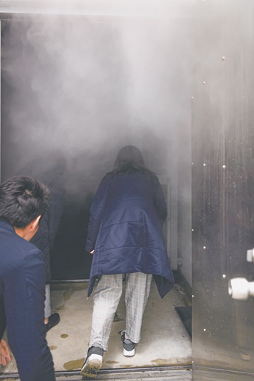 通常は消防学校の訓練に使用されている臨場感のある施設で煙避難体験。