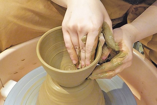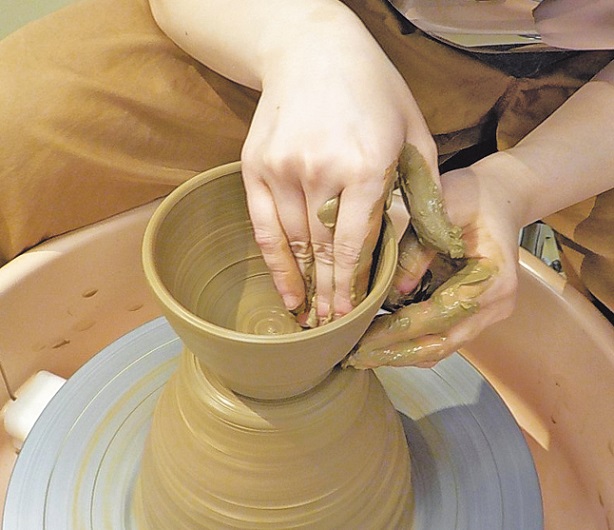 陶芸体験では窯元が丁寧にろくろの使い方を教えてくれます。 |