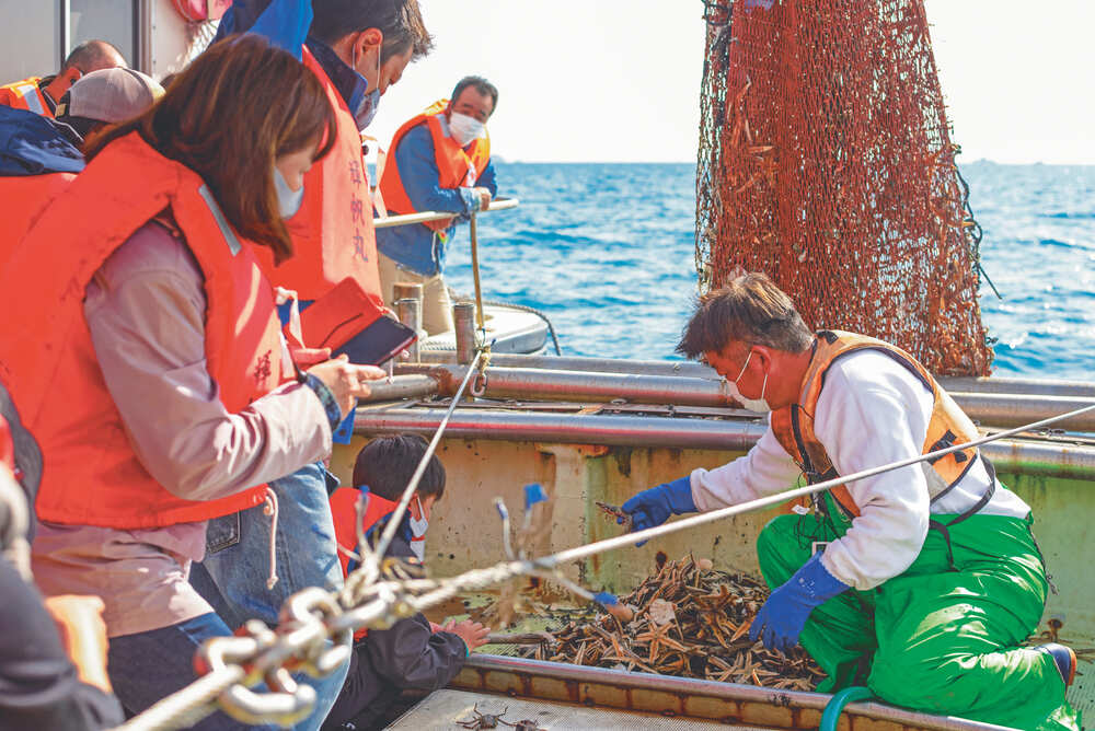 漁師が底引き網で取れた魚介類を説明してくれます |