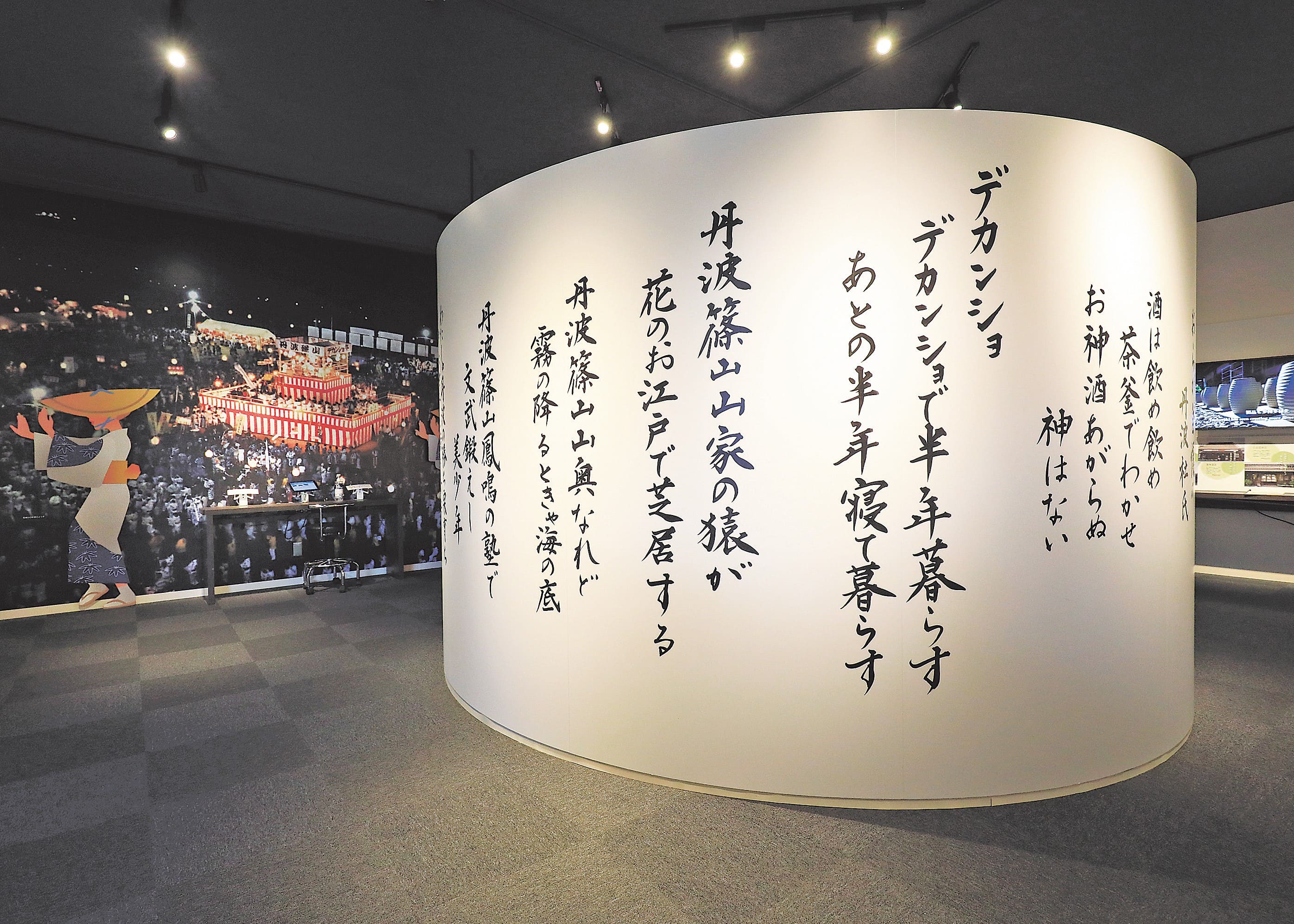 デカンショ節の代表的な10節をパネル展示。歌詞は300節以上あり、現在も公募により毎年増えています。 |