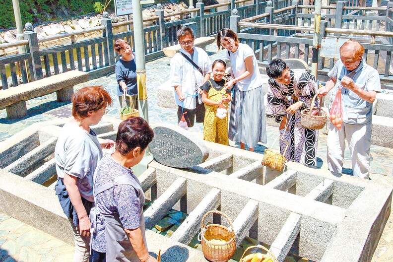 98℃の湯が毎分470ℓも湧出する湯村温泉の源泉「荒湯」。地元では高温の湯つぼで卵や野菜などをゆでる「湯がき文化」が受け継がれてきました。温泉に含まれる重曹成分が野菜のえぐみや苦みを和らげ、甘みを引き立てます。土産物店では観光客向けにネットに入った卵やトウモロコシを販売。