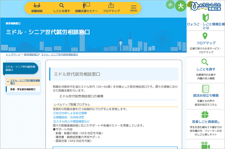 兵庫県では、就職に関するワンストップサービスセンターとして就職支援と職業能力開発等の情報提供を行うひょうご・しごと情報広場内に、ミドル世代(40~64歳)、シニア世代(65歳以上)を対象とした就労相談窓口を設けている。
