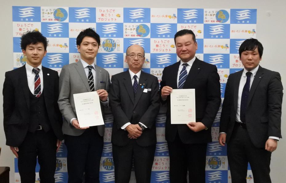 兵庫県で「第一号」となる「国家戦略特別区域家事支援外国人受入事業」の基準に適合した事業者に対して、特定機関基準適合通知書の交付式を行い、片山産業労働部長から通知書を交付しました。
