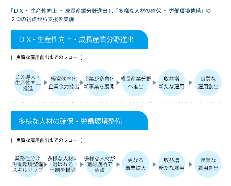 生産年齢人口が減少する中、コロナ後の人流回復で、製造や観光の現場で人手不足が深刻化している社会経済情勢下では良質な雇用を引き続き創出できる企業経営が求められます。生産性向上と成長産業分野への進出・多様な人材の確保等を支援することで、その実現を目指します。