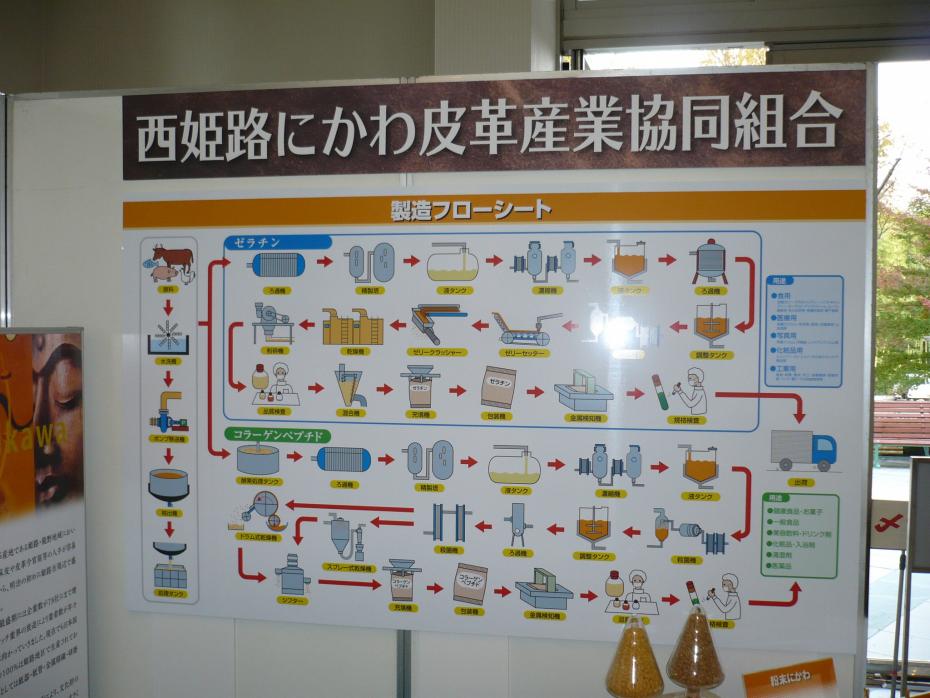 さらに、姫路地区ではコラーゲンペプチドも国内の50%を占めている。コラーゲンペプチドはゼラチンを酵素で分解して消化吸収力を高めた製品である。水に溶け、冷えても固まらない。臭い、味も殆ど無くコーヒーに入れたり、料理に加えたりどんな形でも使えるので一気に利用が広がった。原料は牛、豚、魚、鶏などで、近年魚由来製品が伸びており、美肌、保湿を目的とした美容用途、関節痛緩和など健康食品用途に幅広く使用されている。生産工程図(PDF:36KB)